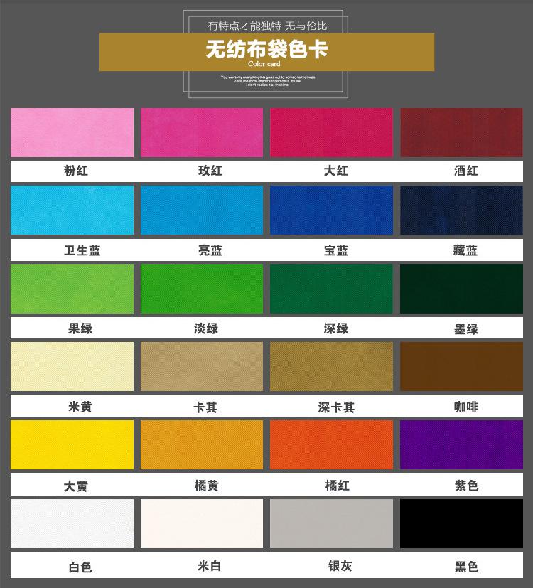無(wú)紡布袋常用的色彩有:大赤色、粉赤色、淺粉色、米黃色、淺米黃色、米白色、棗赤色、梅赤色、紫羅蘭色、土黃色、米色、大黃色、桔赤色、天藍(lán)色、寶石藍(lán)色、果綠色、軍綠色、翠綠色、草綠色、墨綠色、銀灰色、咖啡色、黑色等色彩......【點(diǎn)擊檢查無(wú)紡布袋常用色卡】